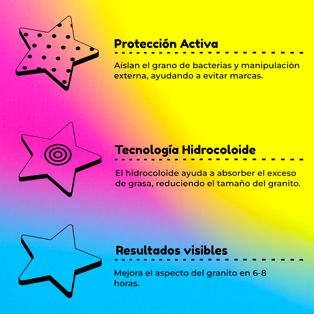 Nuestros Stickies son parches de hidrocoloide que absorben el pus y la suciedad del grano mientras lo protegen del exterior.